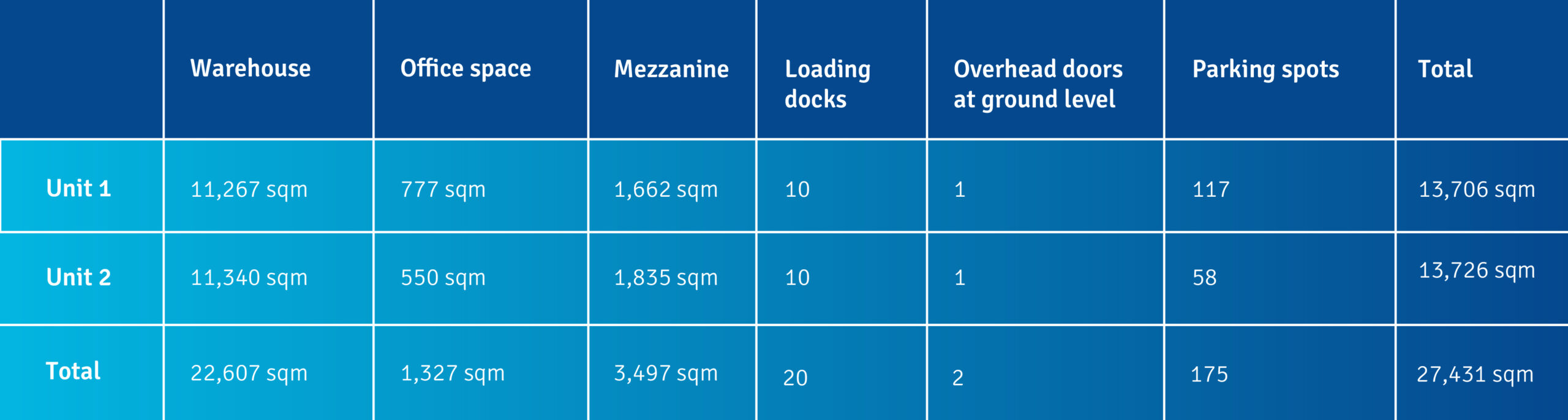 De Loeten distribution center is a unique and very modern development in business park De Loeten in Amstelveen and offers approximately 27,400 sqm of rentable floor space. The distribution center has the ability to split the building into two equal parts of approximately 13,700 sqm. This allows the building to be used by one or two tenants. With a clear height of 12.2 meters and the presence of 20 loading docks and 2 overhead doors at ground level, the object is an excellent base for a logistics service provider.